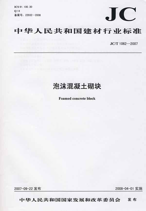 施工單位應(yīng)當(dāng)對(duì)進(jìn)入施工現(xiàn)場(chǎng)的墻體材料、保溫材料、門(mén)窗、采暖制冷系統(tǒng)和照明設(shè)備進(jìn)行檢驗(yàn),不符合施工圖設(shè)計(jì)文件要求的,不得使用!   中華人民共和國(guó)建材行業(yè)標(biāo)準(zhǔn) JC/T1062-2007 泡沫混凝土砌塊 2008-04-01實(shí)施   國(guó)家標(biāo)準(zhǔn)